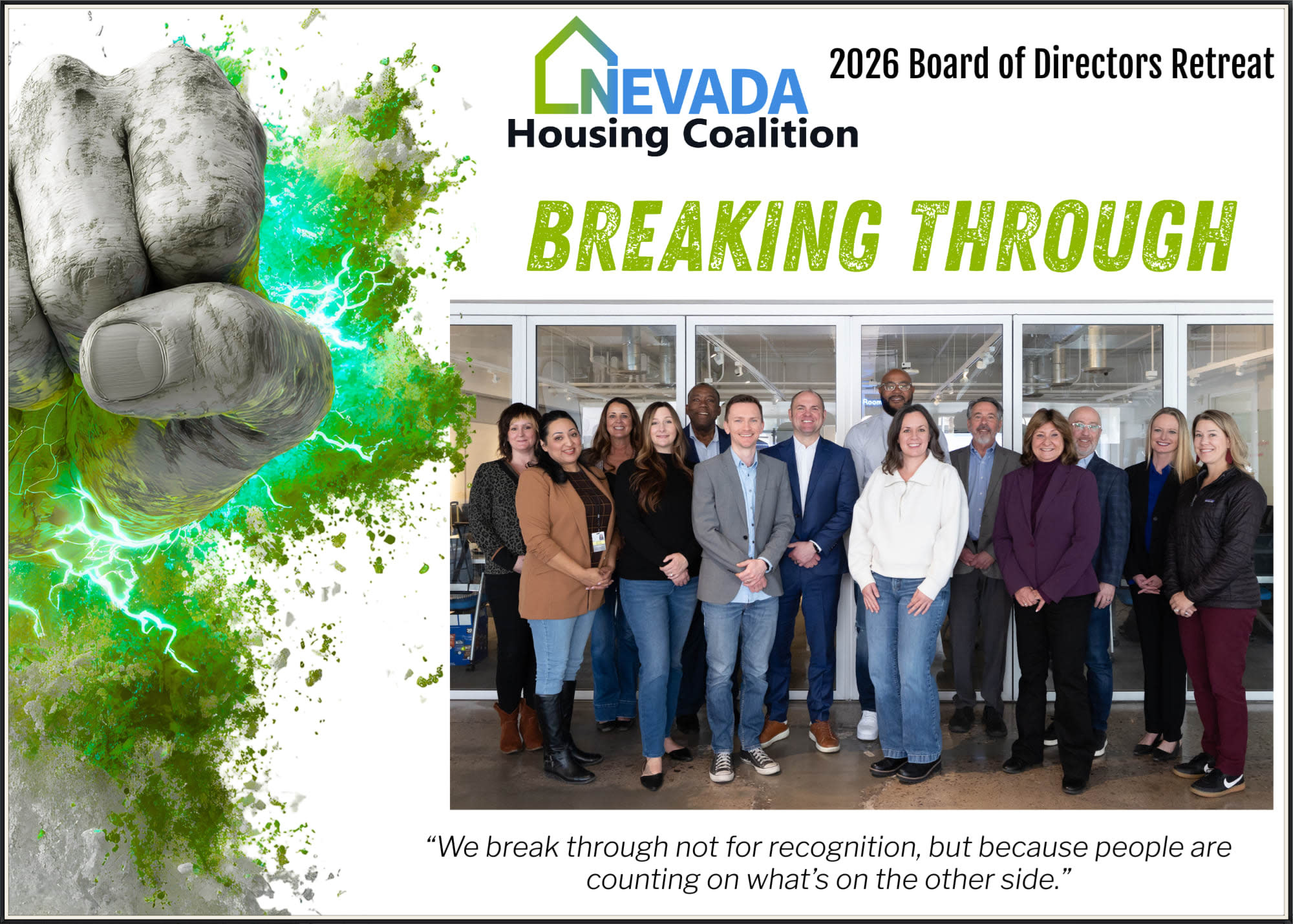 As we step into 2026, we are energized by the momentum already underway. We’ve hit the ground running with a new Executive Committee and new board members, bringing fresh perspectives and renewed commitment to advancing affordable and attainable housing across Nevada. Just this week, we gathered our board for a retreat focused on collaboration, strategy, and the work ahead.