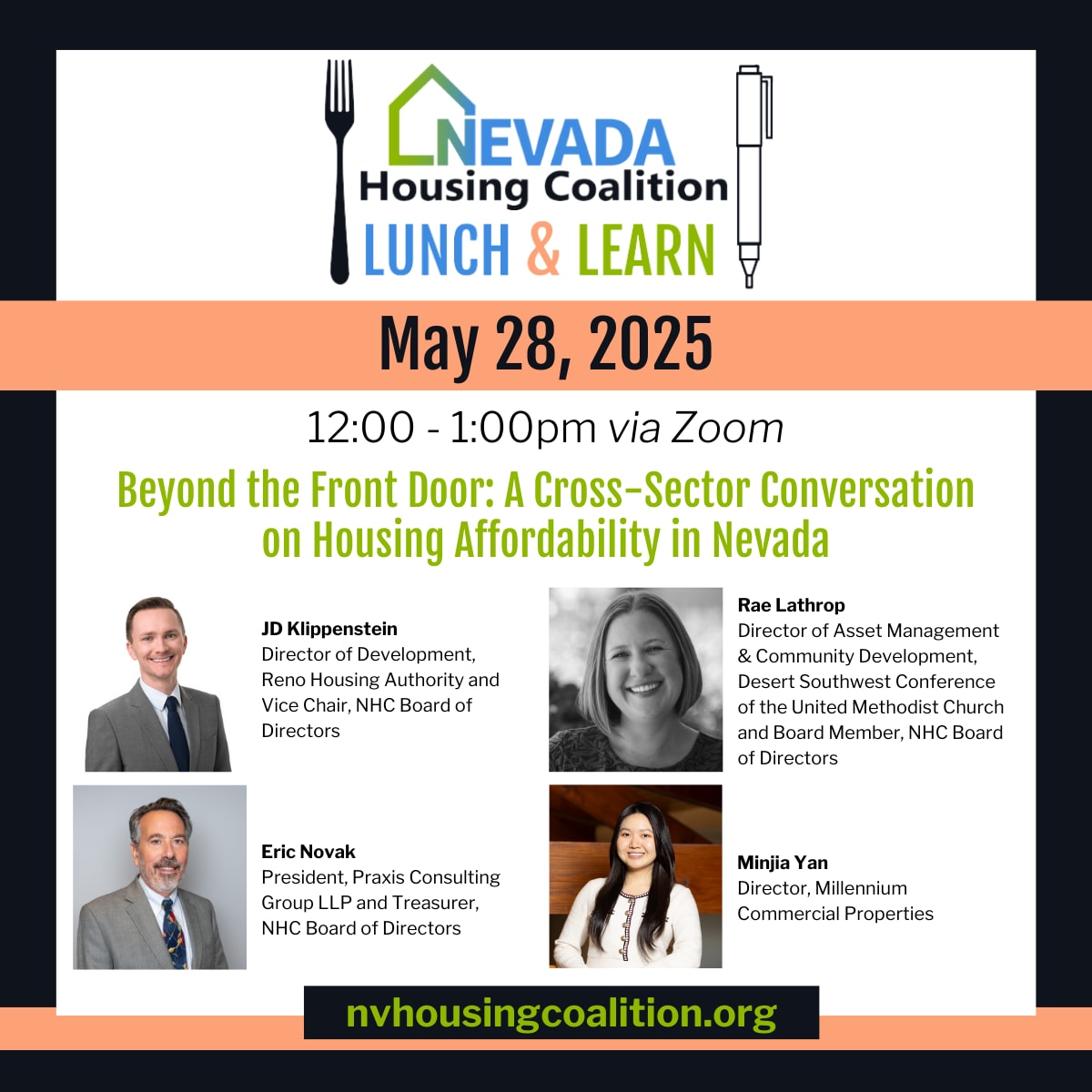The session will be moderated by Rae Lathrop from Desert Southwest Conference of the United Methodist Church and is ideal for anyone invested in the future of Nevada’s housing affordability.